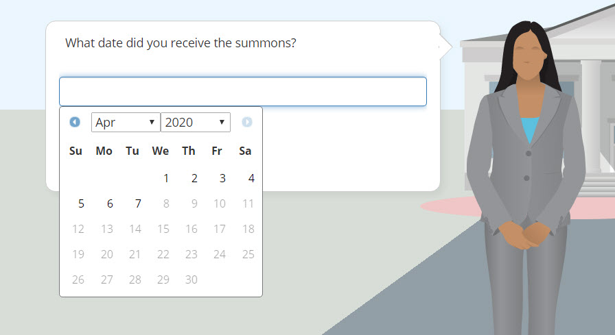 A2J Author includes a calendar for the end user to select from when using a date field. The calendar automatically displays when the end user clicks into the date field to begin typing their date answer (see figure below).