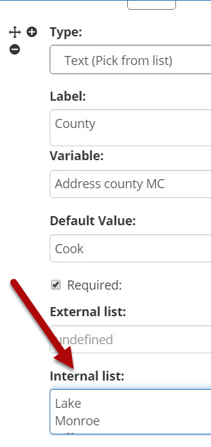 The Text (Pick from list) Field Type includes the ability to provide a custom drop-down list (internal list) or attach a pre-formatted (.xml) (external) list. |